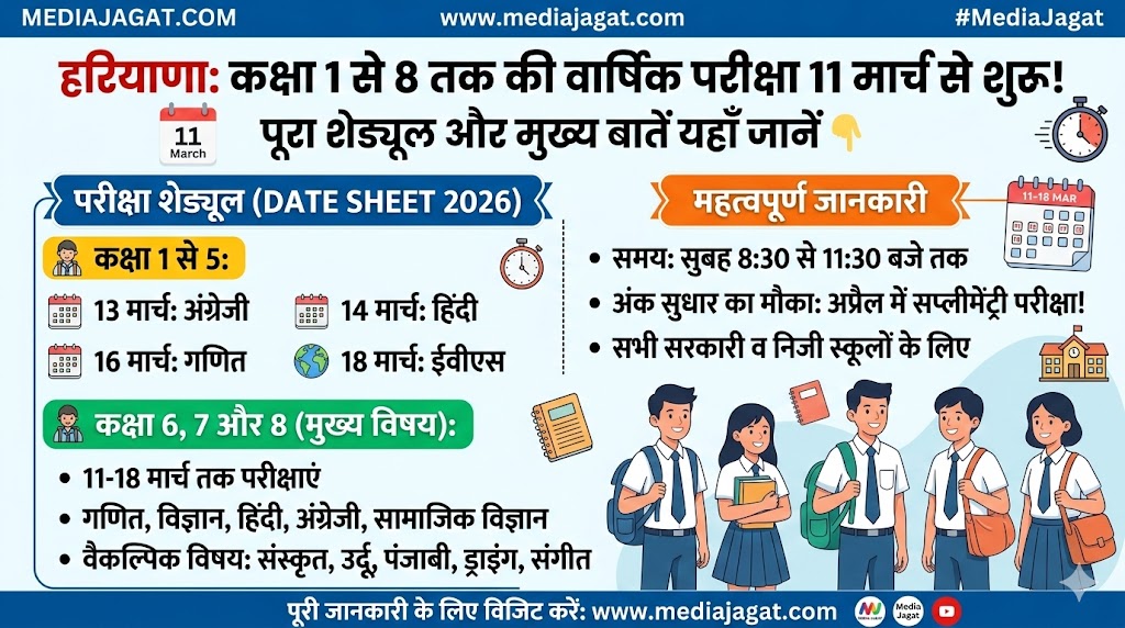 चंडीगढ़ (Media Jagat Desk): हरियाणा के सरकारी और मान्यता प्राप्त निजी स्कूलों में पढ़ने वाले लाखों विद्यार्थियों और उनके अभिभावकों के लिए जरूरी खबर है। हरियाणा विद्यालय शिक्षा निदेशालय (Directorate of School Education Haryana) ने शैक्षणिक सत्र 2025-26 के लिए कक्षा 1 से 8वीं तक की वार्षिक परीक्षाओं की डेटशीट (Annual Exam Date Sheet) आधिकारिक तौर पर जारी कर दी है।