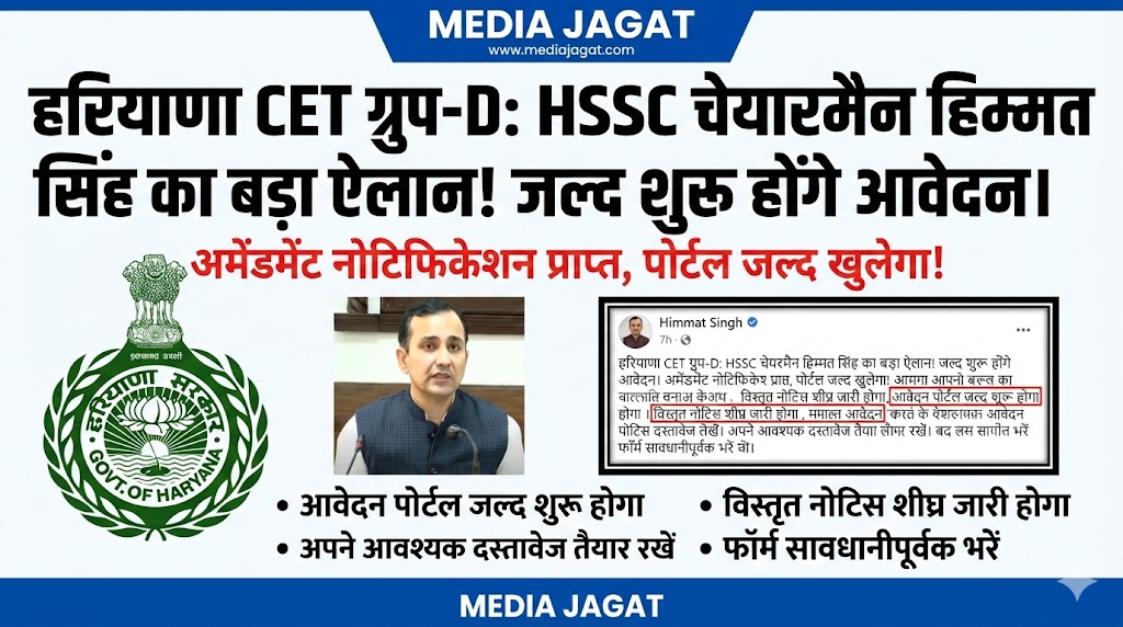 चंडीगढ़/पंचकूला (Media Jagat Job Desk): हरियाणा में सरकारी नौकरी (Sarkari Naukri) की तैयारी कर रहे लाखों युवाओं का इंतजार अब खत्म होने जा रहा है। हरियाणा कर्मचारी चयन आयोग (HSSC) द्वारा आयोजित की जाने वाली CET Group D (सीईटी ग्रुप-डी) परीक्षा को लेकर एक बहुत ही सकारात्मक और बड़ी खबर सामने आई है।