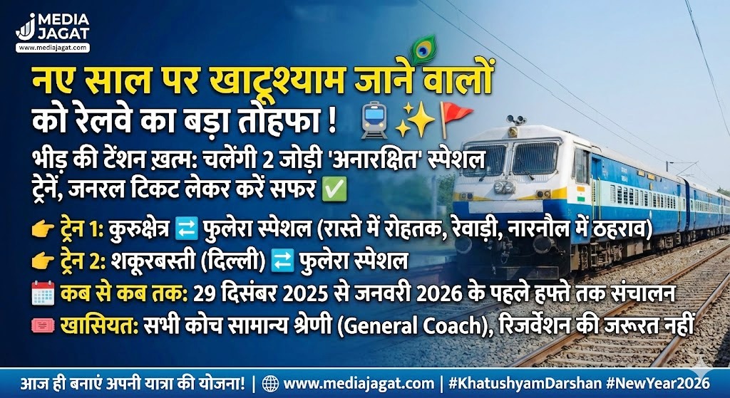 Indian Railways News: नए साल 2026 के आगमन पर अगर आप भी राजस्थान के प्रसिद्ध धार्मिक स्थल खाटूश्याम जी (Khatushyam Ji), सालासर या जयपुर घूमने का प्लान बना रहे हैं, तो यह खबर आपके लिए राहत भरी है। नववर्ष पर होने वाली भारी भीड़ को देखते हुए उत्तर रेलवे (Northern Railway) ने हरियाणा, दिल्ली और राजस्थान के यात्रियों को बड़ा तोहफा दिया है।