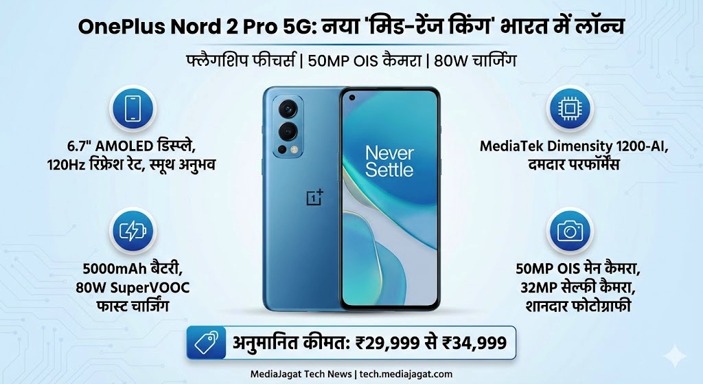 नई दिल्ली (Media Jagat Bureau) :स्मार्टफोन की दुनिया में 'मिड-रेंज किंग' कहे जाने वाले OnePlus ने एक बार फिर बाजार में हलचल मचा दी है। कंपनी ने अपना नया धुरंधर OnePlus Nord 2 Pro 5G लॉन्च कर दिया है। यह फोन उन लोगों के लिए एक तोहफा है जो 50-60 हजार रुपये खर्च किए बिना एक प्रीमियम फोन का अनुभव लेना चाहते हैं।