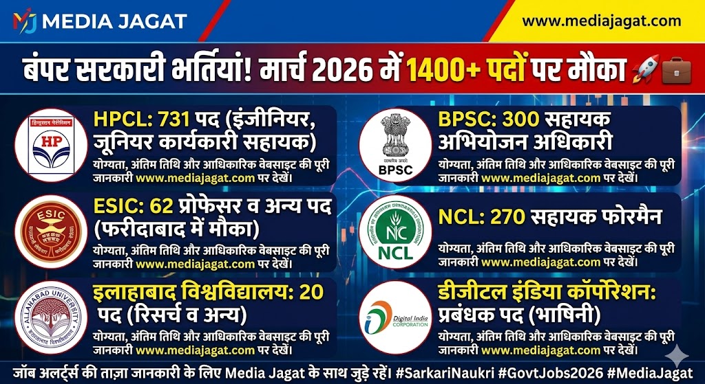 Media Jagat आपके लिए लेकर आया है इन सभी प्रमुख भर्तियों की पूरी और सटीक जानकारी, ताकि कोई भी शानदार मौका आपके हाथ से न छूटे।