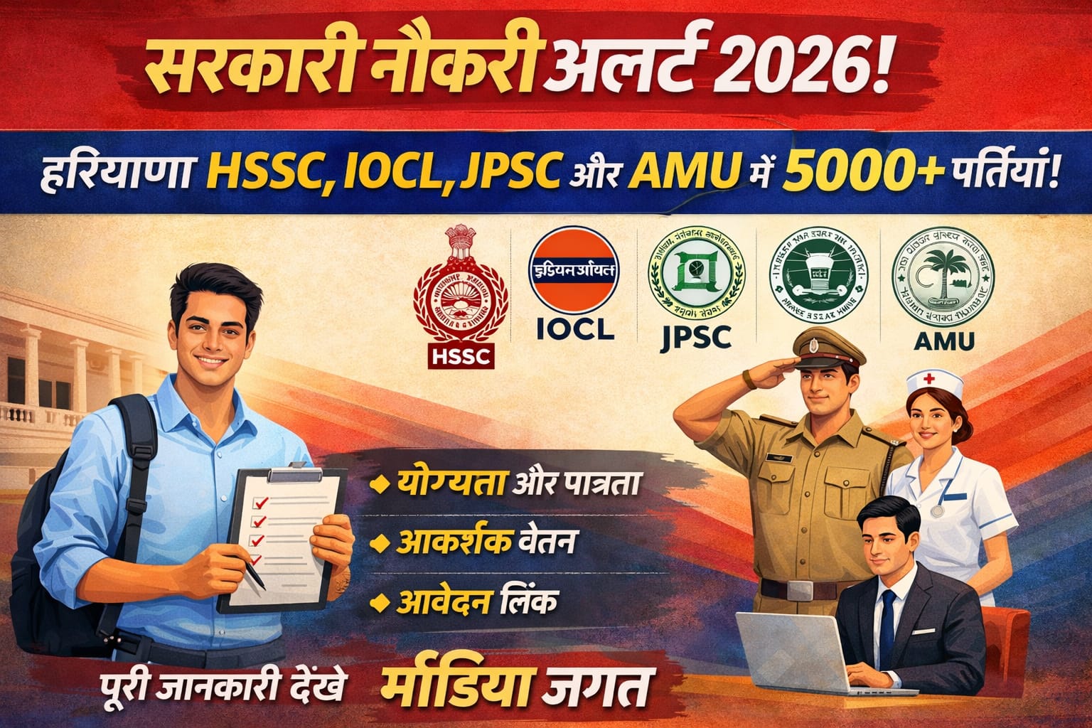 नई दिल्ली/मीडिया जगत डेस्क: अगर आप सरकारी नौकरी की तलाश में हैं, तो फरवरी 2026 का यह महीना आपके लिए सुनहरे अवसर लेकर आया है। हरियाणा कर्मचारी चयन आयोग (HSSC), इंडियन ऑयल (IOCL), और झारखंड लोक सेवा आयोग (JPSC) जैसे प्रतिष्ठित संस्थानों ने विभिन्न पदों के लिए आवेदन आमंत्रित किए हैं।