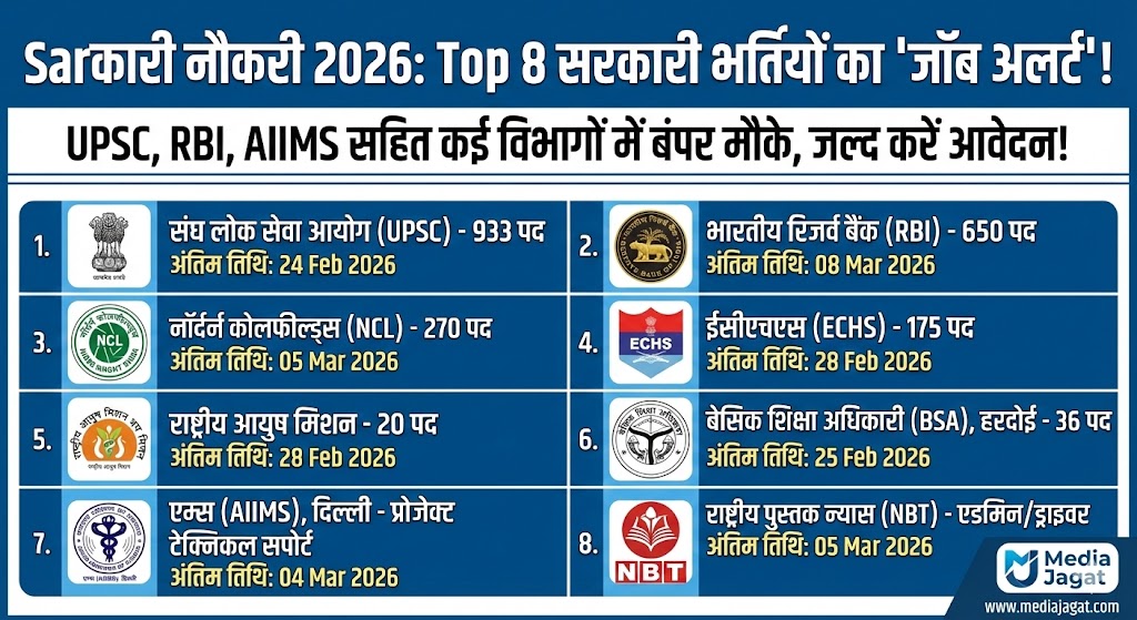 Media Jagat (मीडिया जगत) के इस विशेष 'जॉब अलर्ट' बुलेटिन में आज हम आपको UPSC, भारतीय रिजर्व बैंक (RBI) से लेकर स्वास्थ्य और शिक्षा विभाग में निकली 8 प्रमुख भर्तियों के बारे में विस्तार से बता रहे हैं। 10वीं पास से लेकर ग्रेजुएट और मेडिकल प्रोफेशनल्स तक, सभी के लिए यहाँ शानदार मौके हैं। आइए जानते हैं पूरी डिटेल्स: