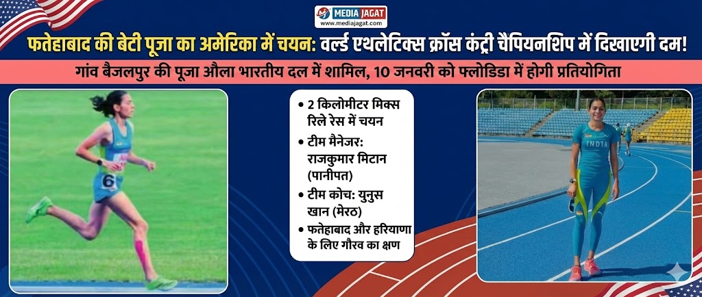 फतेहाबाद की बेटी पूजा का अमेरिका में दिखेगा दम! वर्ल्ड एथलेटिक्स क्रॉस कंट्री चैंपियनशिप के लिए भारतीय टीम में हुआ चयन। गांव बैजलपुर में खुशी की लहर। #MediaJagat